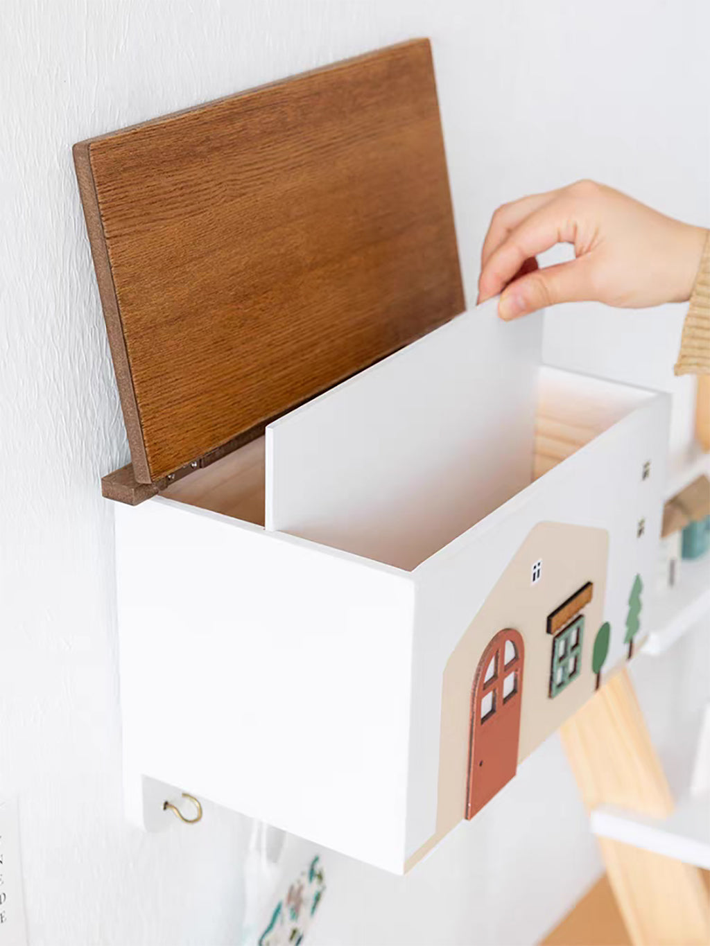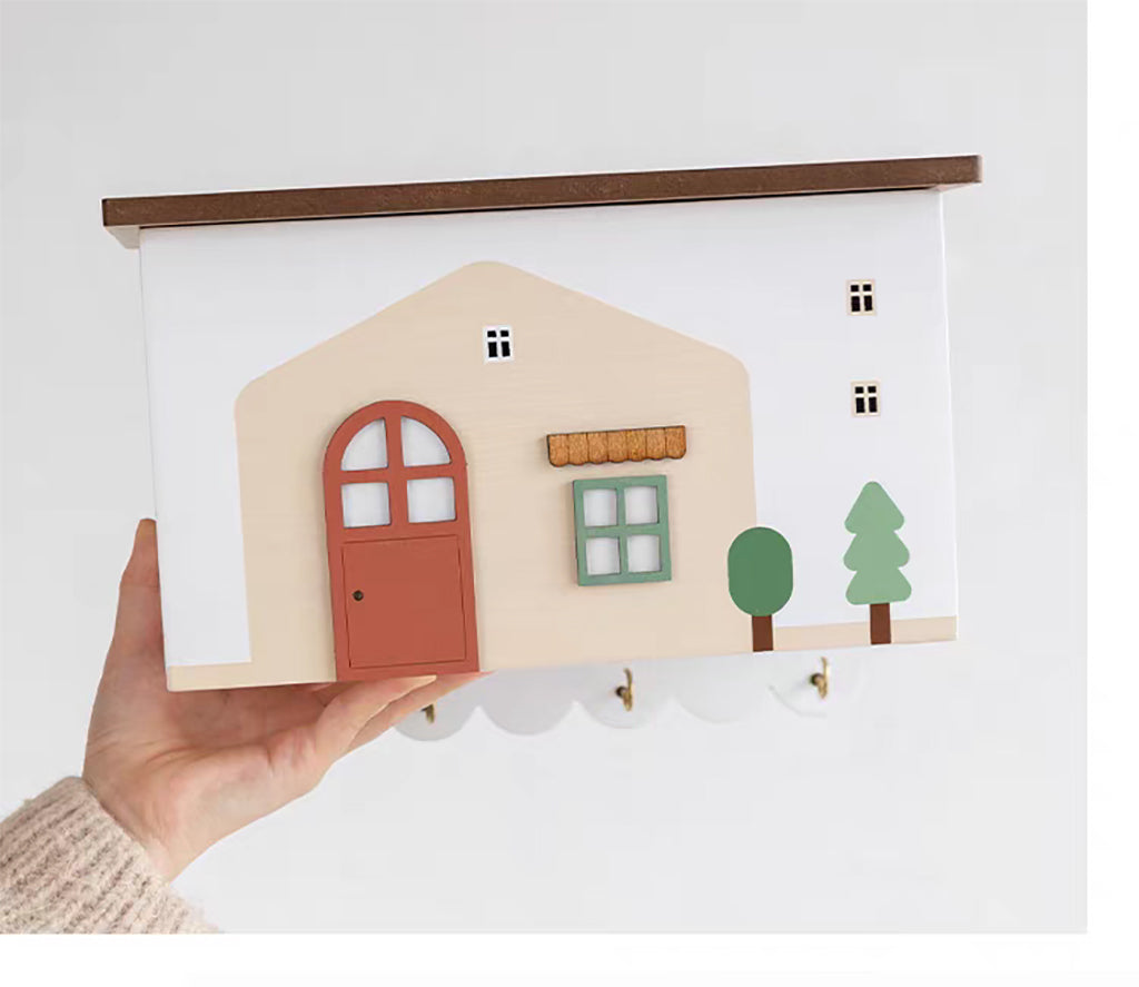 温もりあるおうちのデザインが、何気ない玄関の壁をほっこりと彩ります。ただの収納ではなく、毎日目にする小さな幸せな風景に。